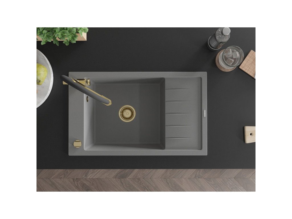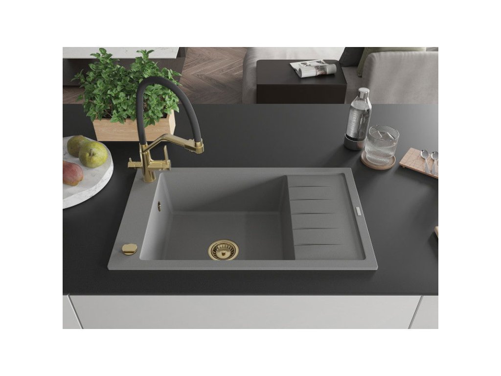 Granitový drez Mexen Elias s 1 misou, odkapávačom a kuchynskou batériou Duo, sivý - 6511-71-671701-57-G