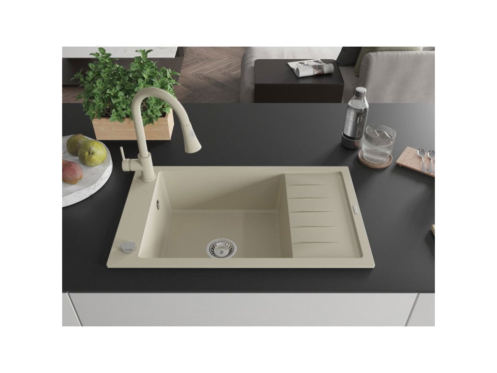 Granitový drez Mexen Elias s 1 misou, odkapávačom a kuchynskou batériou Elia, béžový - 6511-69-670101-69