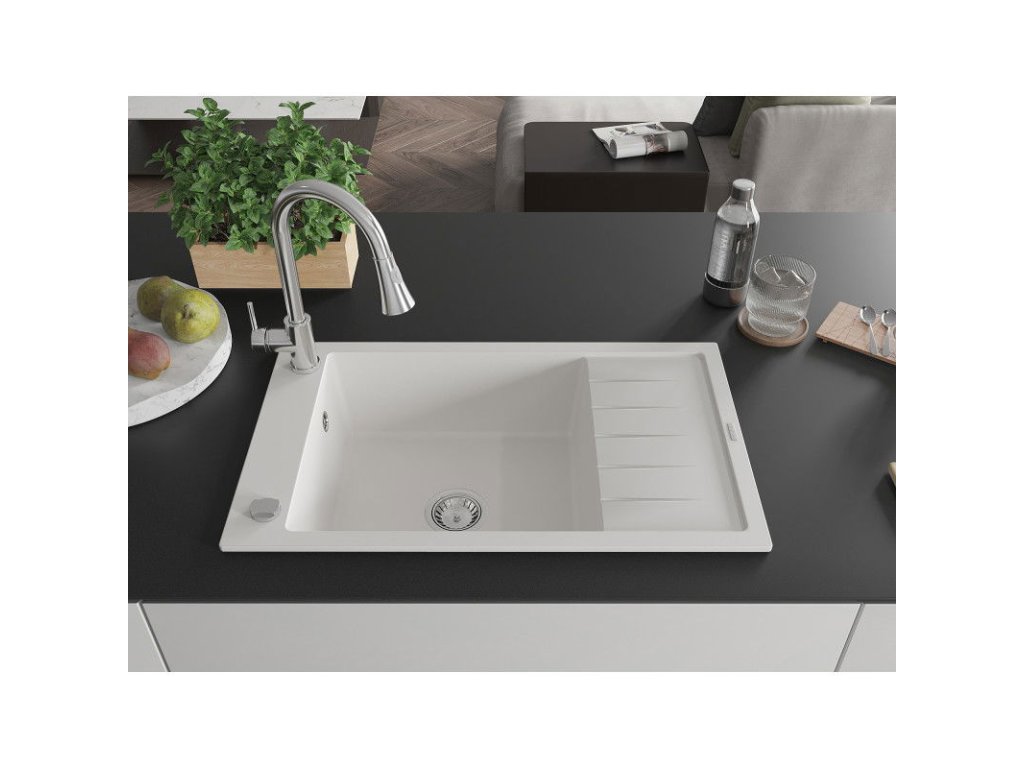 Granitový drez Mexen Elias s 1 misou, odkapávačom a kuchynskou batériou Elia, biely - 6511-20-670101-00