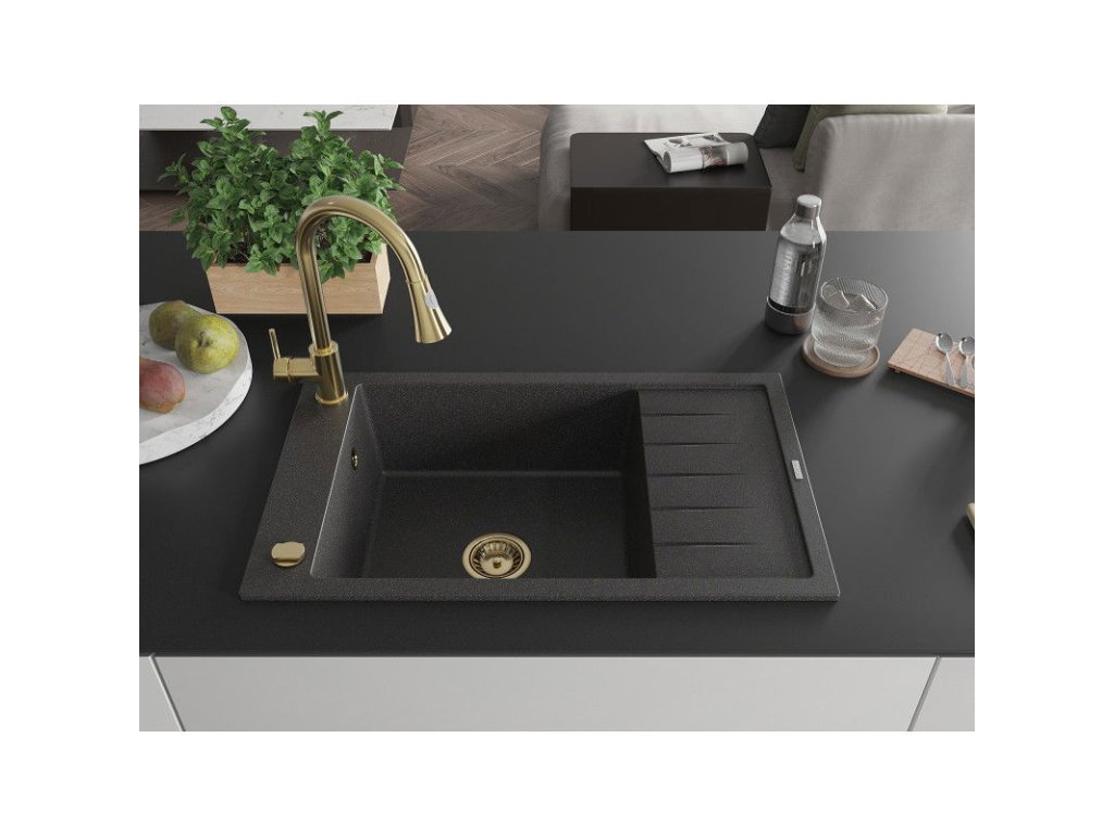 Granitový drez Mexen Elias s 1 misou, odkapávačom a kuchynskou batériou Elia, čierna škvrnitá - 6511-76-670101-50