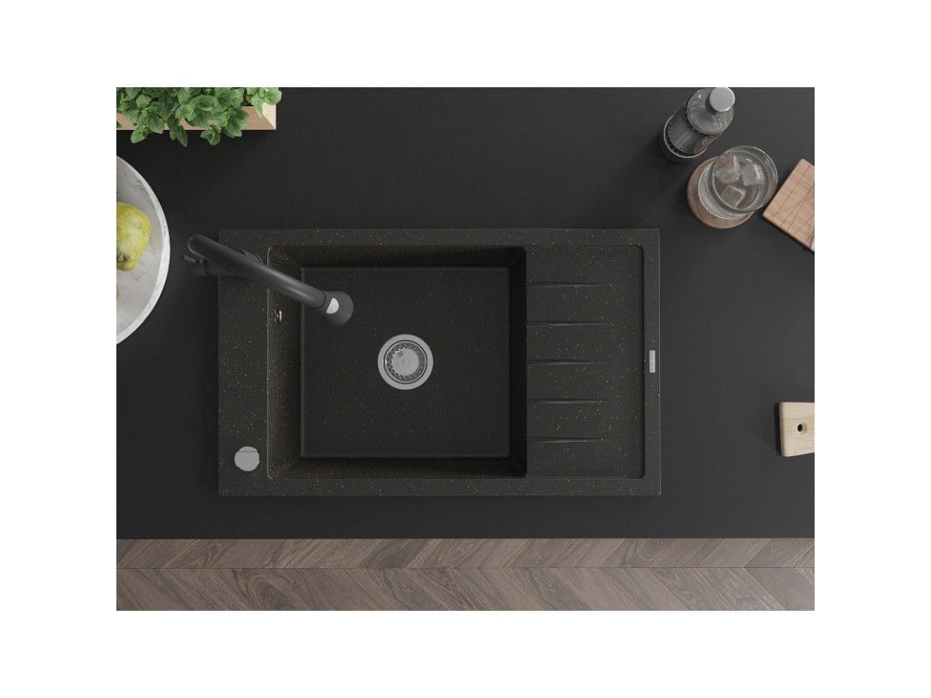 Granitový drez Mexen Elias s 1 misou, odkapávačom a kuchynskou batériou Elia, čierna/zlatá metalíza - 6511-75-670101-70