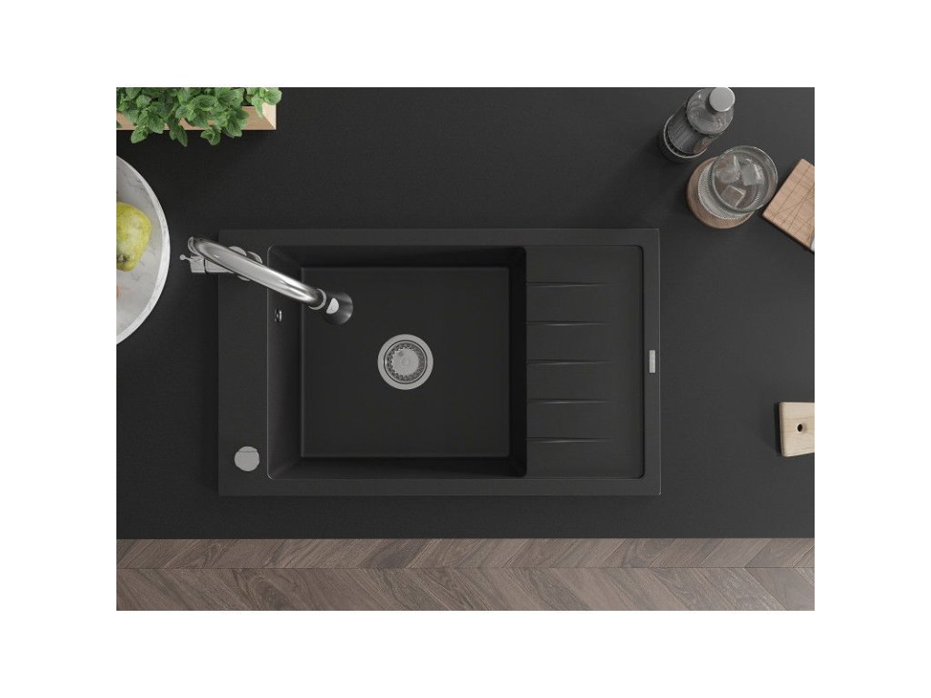 Granitový drez Mexen Elias s 1 misou, odkapávačom a kuchynskou batériou Elia, čierny - 6511-77-670101-00