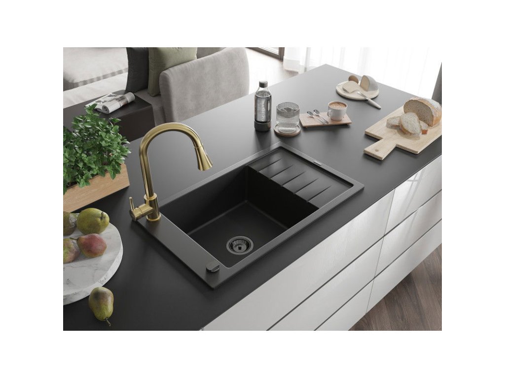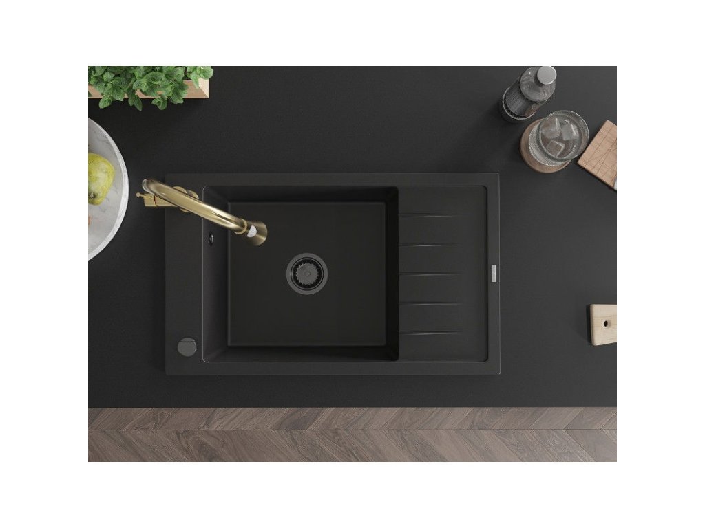 Granitový drez Mexen Elias s 1 misou, odkapávačom a kuchynskou batériou Elia, čierny - 6511-77-670101-50-B