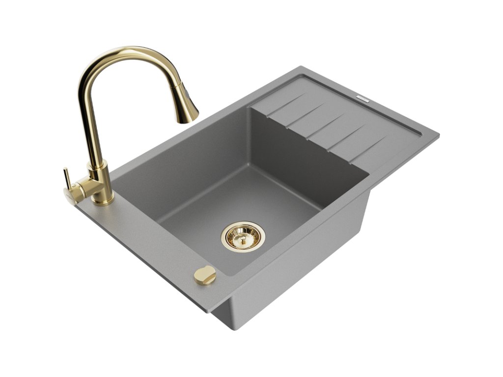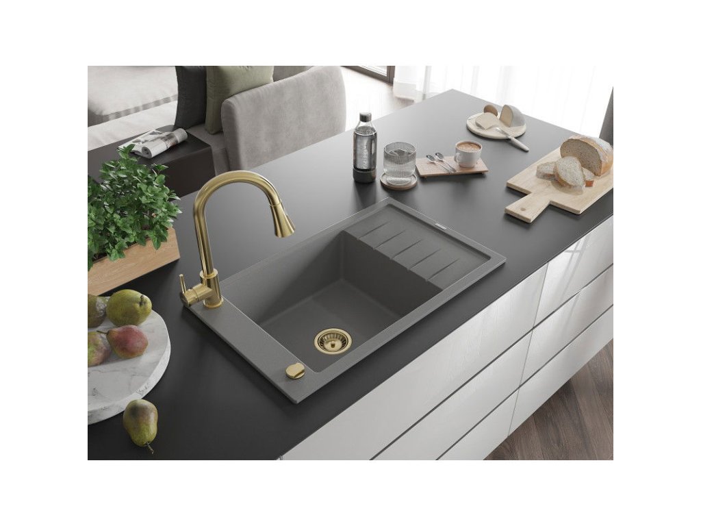 Granitový drez Mexen Elias s 1 misou, odkapávačom a kuchynskou batériou Elia, sivý - 6511-71-670101-50