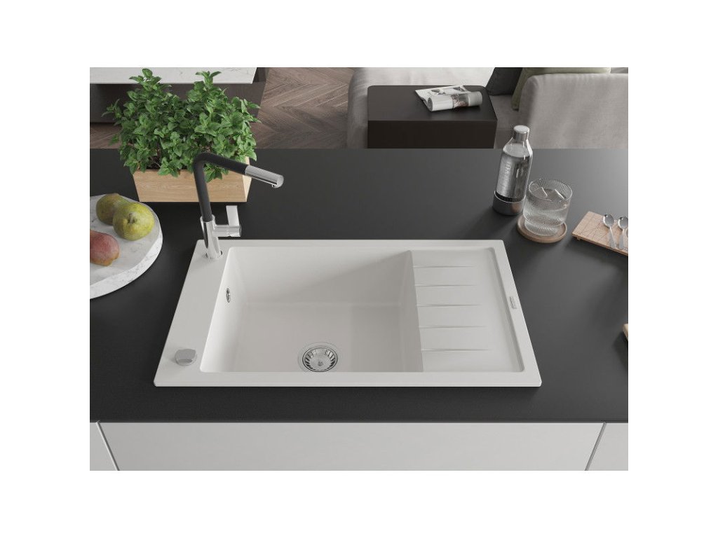 Granitový drez Mexen Elias s 1 misou, odkapávačom a kuchynskou batériou Flora, biely - 6511-20-670401-07