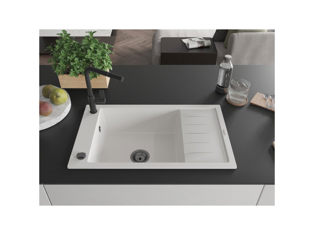 Granitový drez Mexen Elias s 1 misou, odkapávačom a kuchynskou batériou Flora, biely - 6511-20-670401-70-B
