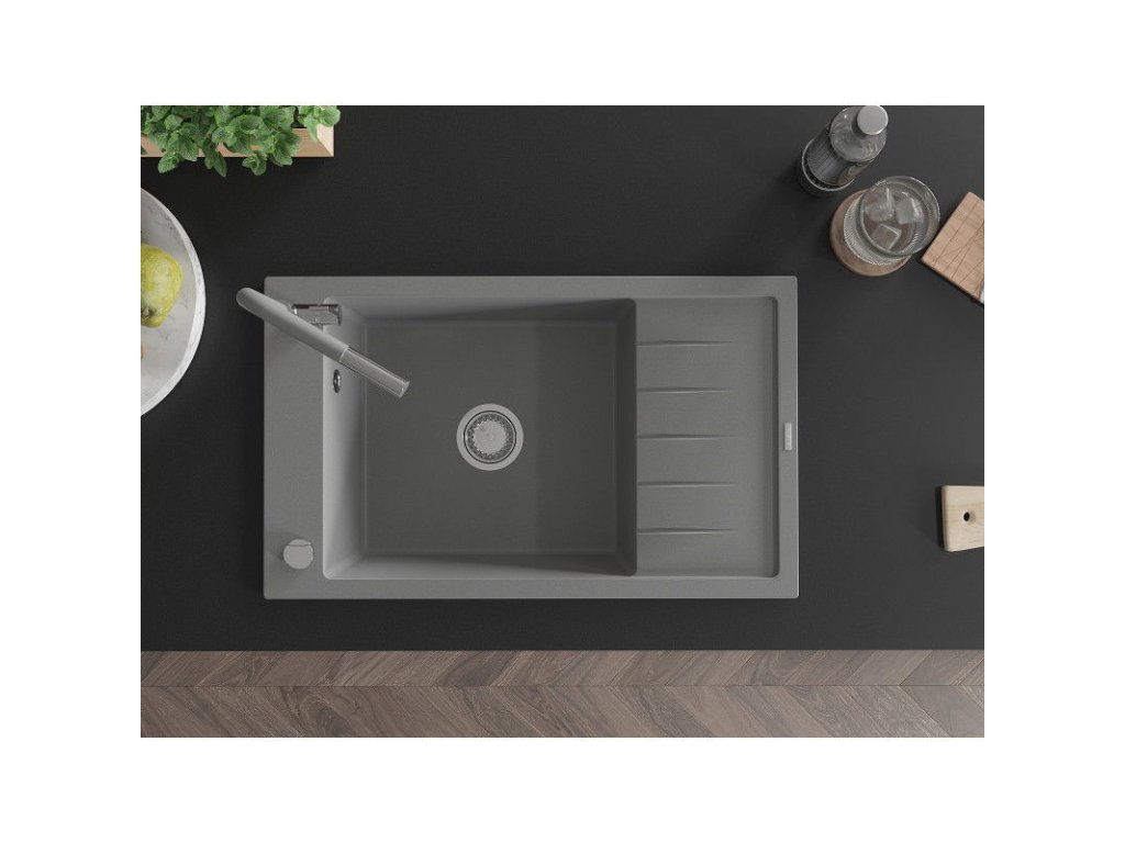 Granitový drez Mexen Elias s 1 misou, odkapávačom a kuchynskou batériou Flora, sivý - 6511-71-670401-06