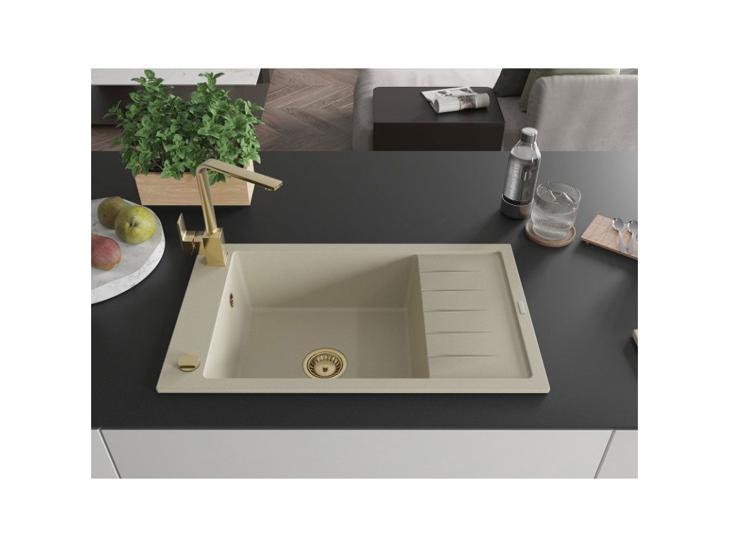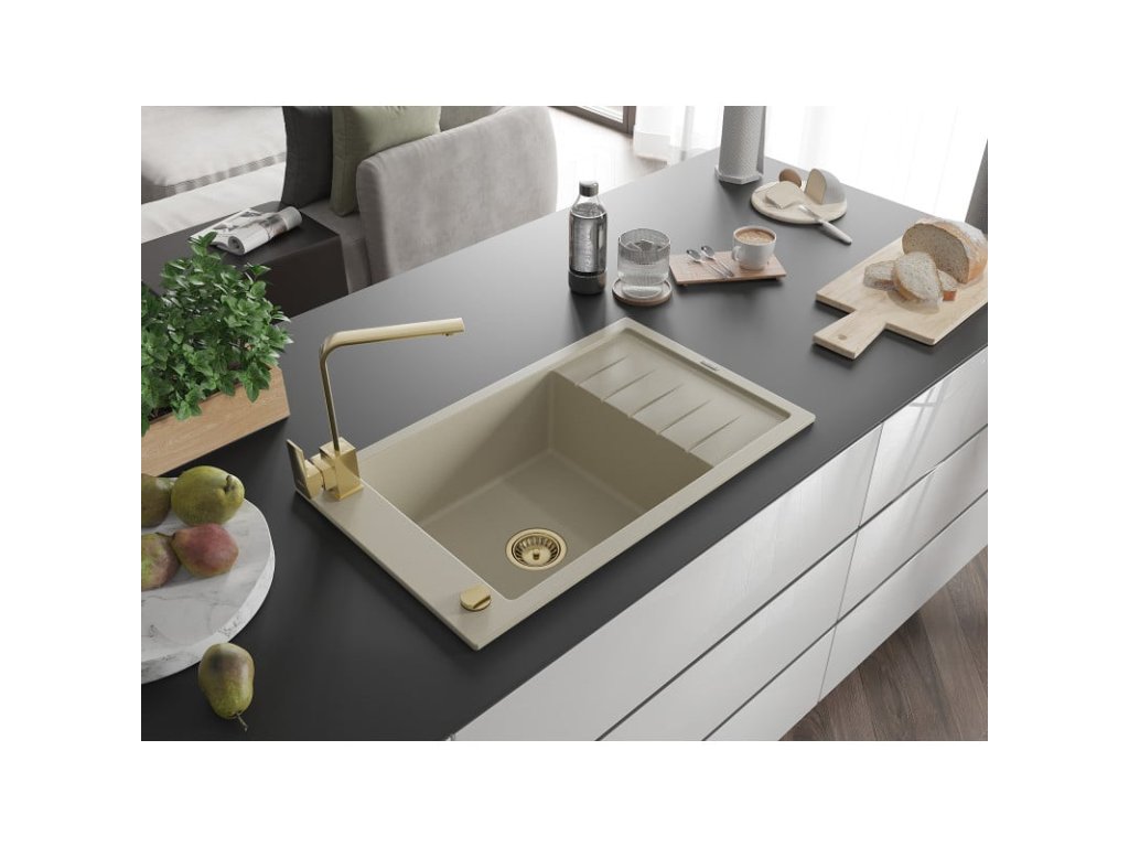 Granitový drez Mexen Elias s 1 misou, odkapávačom a kuchynskou batériou Rita, béžový - 6511-69-670300-50