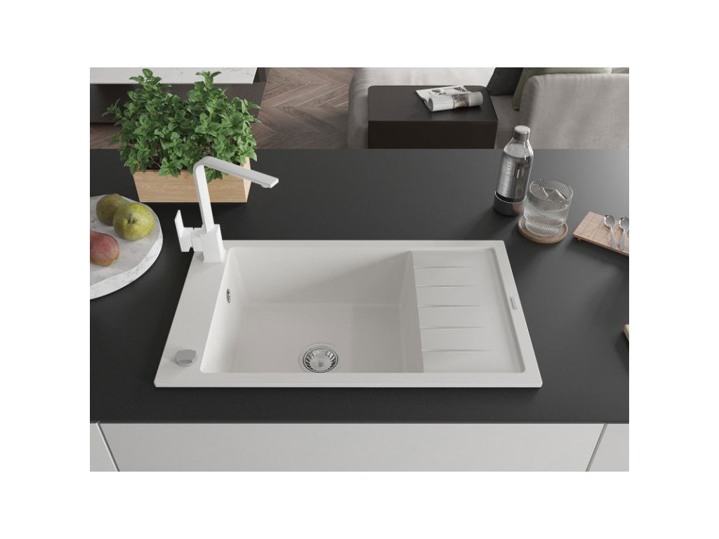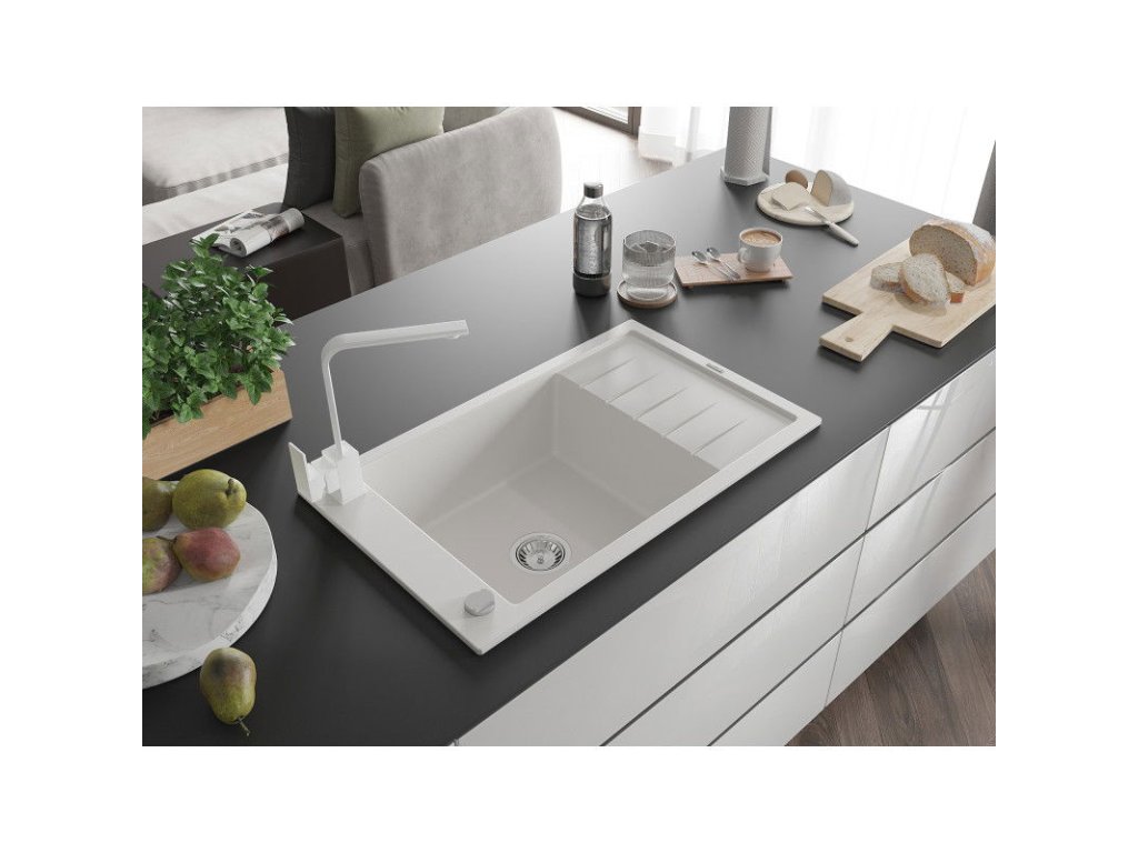 Granitový drez Mexen Elias s 1 misou, odkapávačom a kuchynskou batériou Rita, biely - 6511-20-670300-20