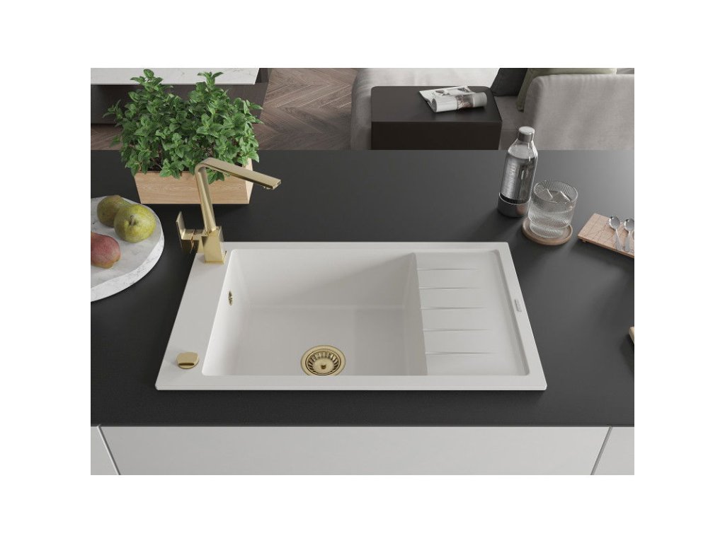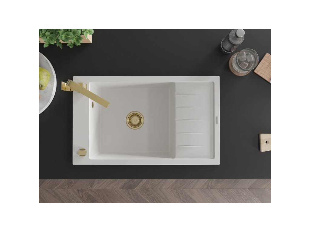 Granitový drez Mexen Elias s 1 misou, odkapávačom a kuchynskou batériou Rita, biely - 6511-20-670300-50