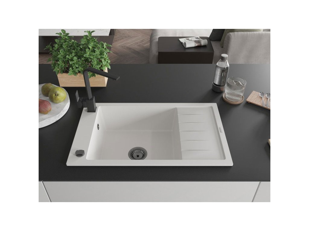 Granitový drez Mexen Elias s 1 misou, odkapávačom a kuchynskou batériou Rita, biely - 6511-20-670300-70