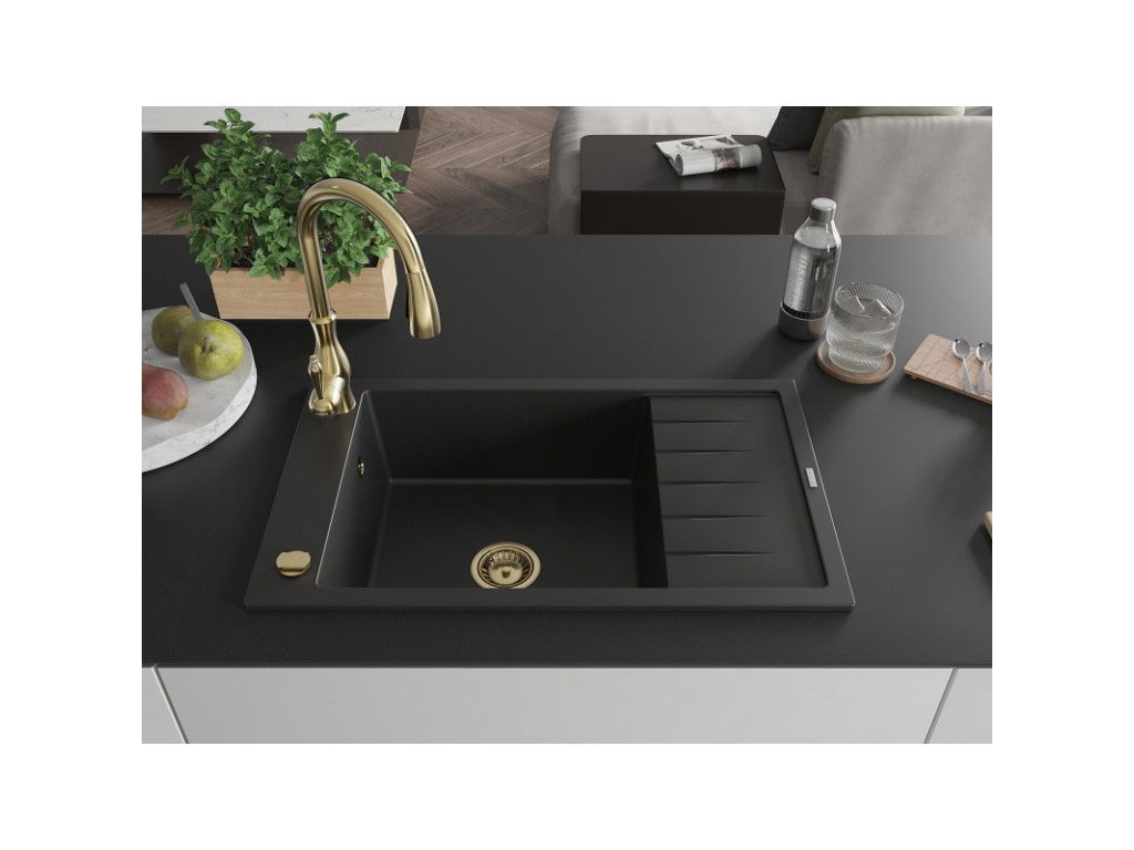 Granitový drez Mexen Elias s 1 misou, odkapávačom a kuchynskou batériou Savita, čierny - 6511-77-672601-50