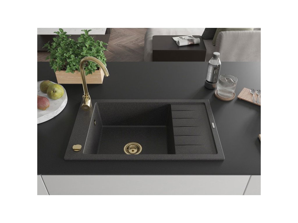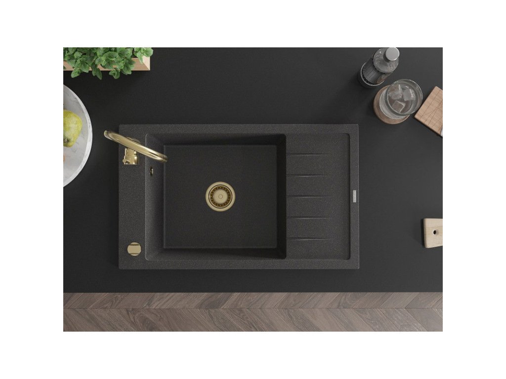 Granitový drez Mexen Elias s 1 misou, odkapávačom a kuchynskou batériou Telma, čierna škvrnitá - 6511-76-670200-50