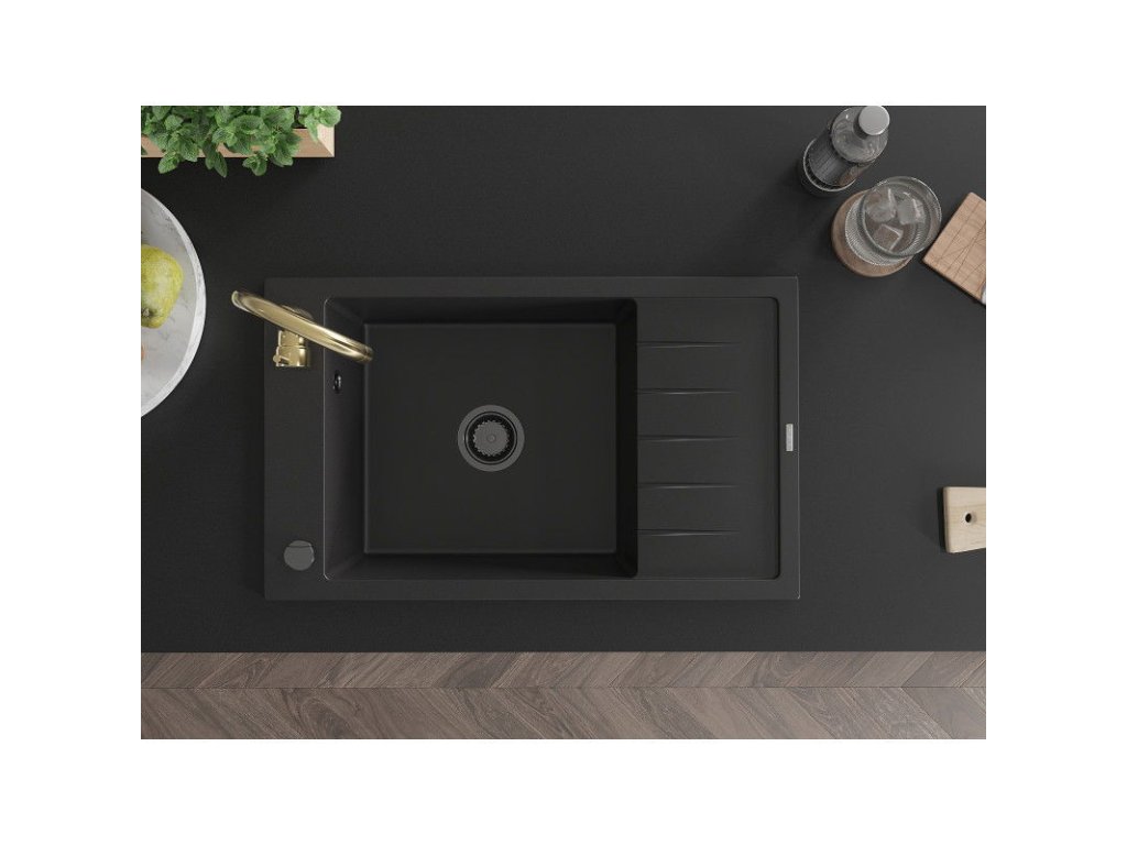 Granitový drez Mexen Elias s 1 misou, odkapávačom a kuchynskou batériou Telma, čierny - 6511-77-670200-50-B