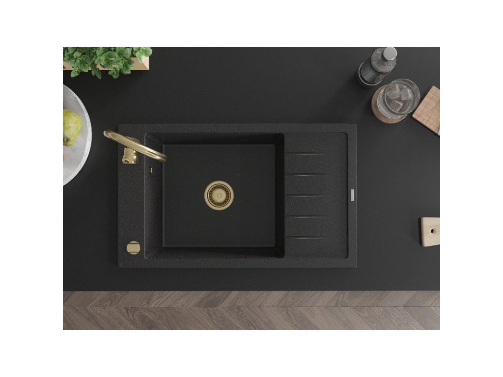 Granitový drez Mexen Elias s 1 misou a odkapávačom 795 x 480 mm, čierna/strieborná metalíza, zlatý sifón - 6511791005-73-G