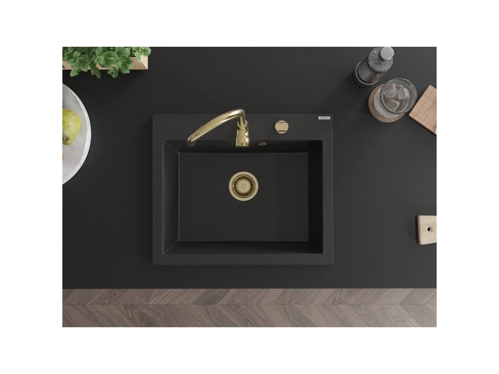 Granitový drez Mexen Elix s 1 misou 600 x 500 mm, čierna/strieborná metalíza, zlatý sifón - 6525601005-73-G