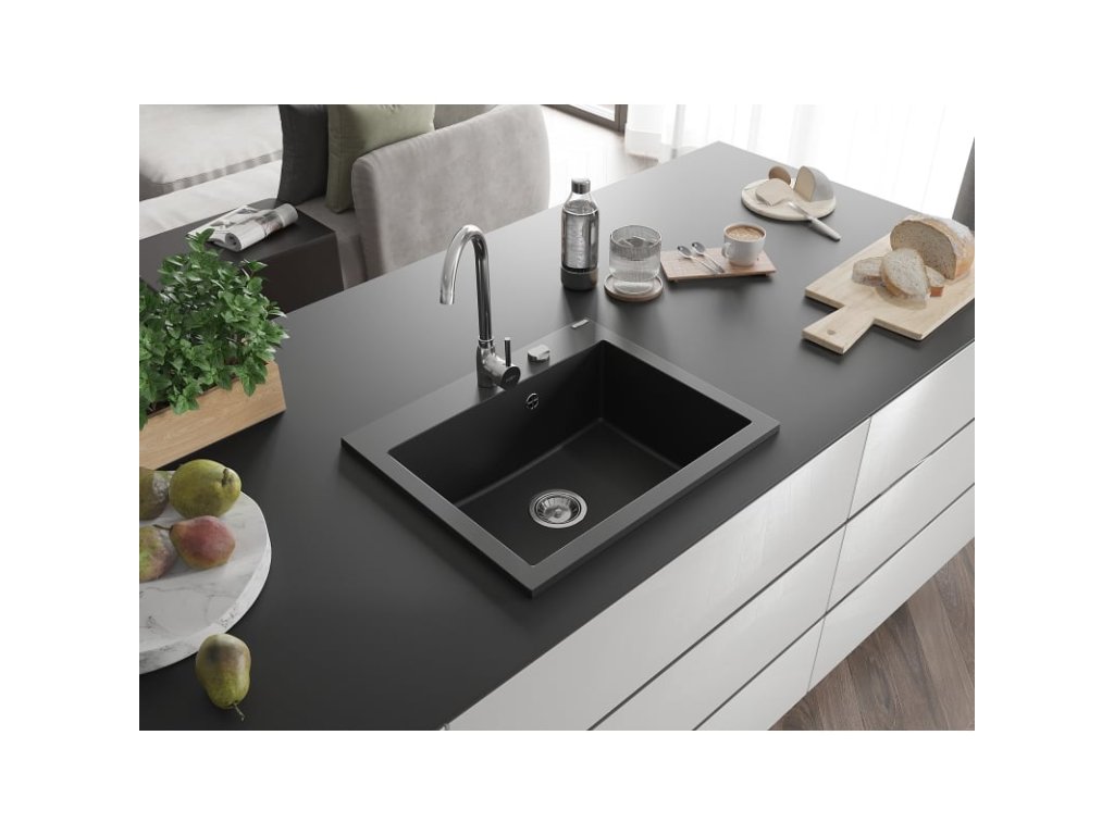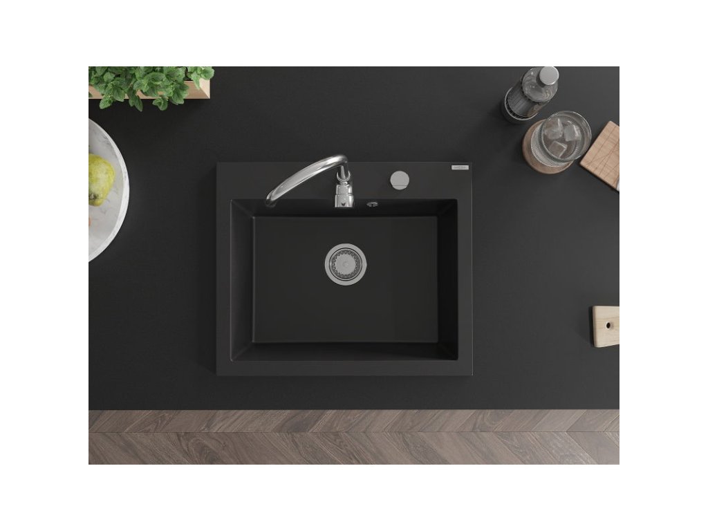 Granitový drez Mexen Elix s 1 misou 600 x 500 mm, čierny, chrómový sifón - 6525601005-77