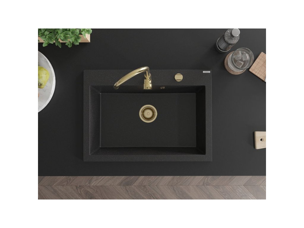 Granitový drez Mexen Elix s 1 misou 700 x 500 mm, čierna/strieborná metalíza, zlatý sifón - 6526701005-73-G