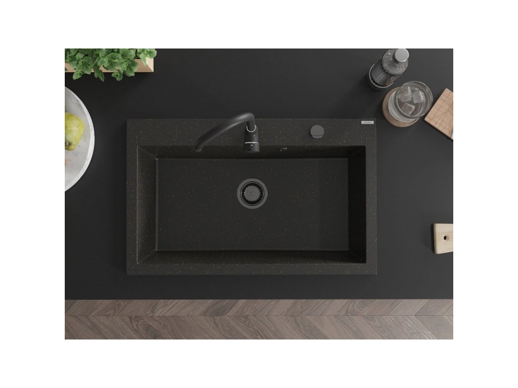 Granitový drez Mexen Elix s 1 misou 800 x 500 mm, čierna/zlatá metalíza, čierny sifón - 6527801005-75-B