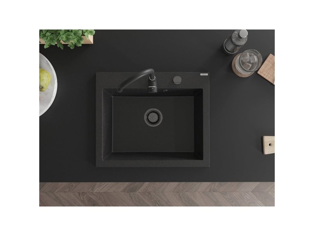 Granitový drez Mexen Elix s 1 umývadlom 600 x 500 mm, čierna/strieborná metalíza, čierny sifón - 6525601005-73-B