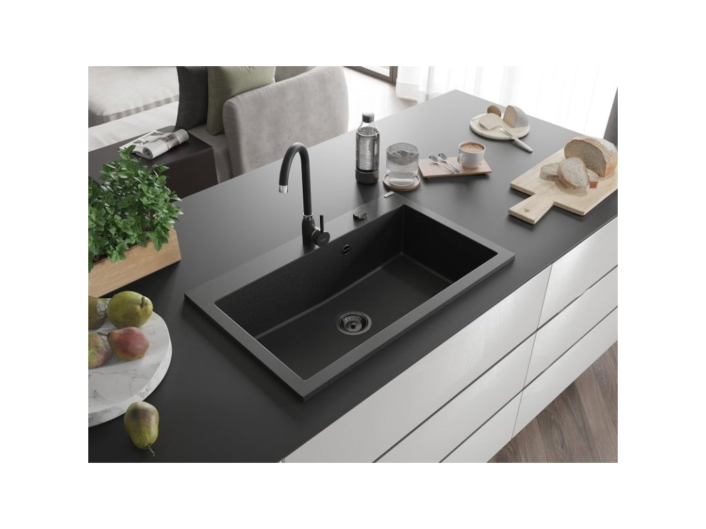 Granitový drez Mexen Elix s 1 umývadlom 800 x 500 mm, čierna/strieborná metalíza, čierny sifón - 6527801005-73-B