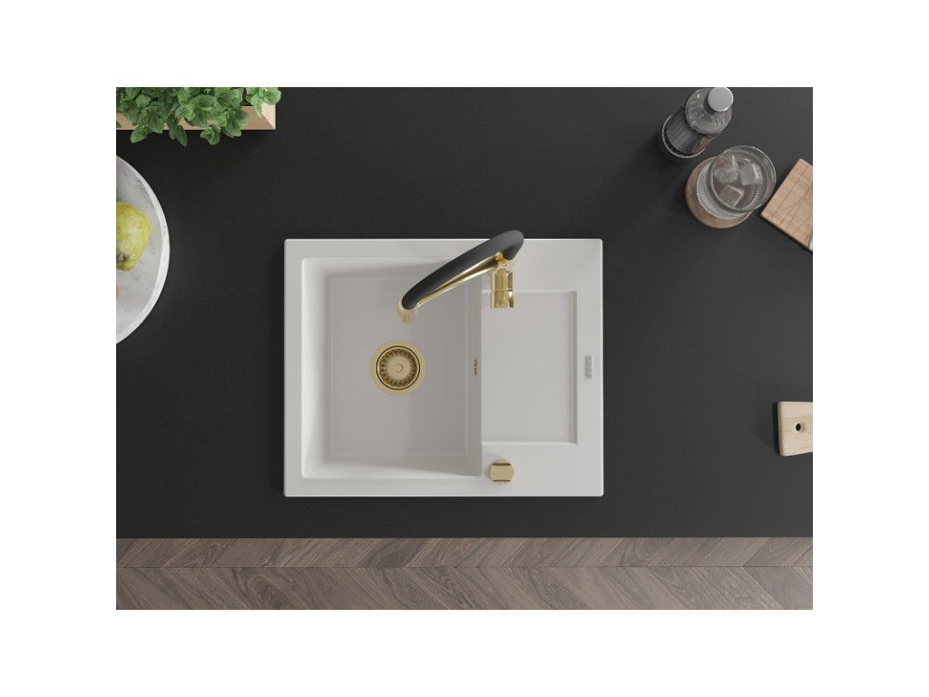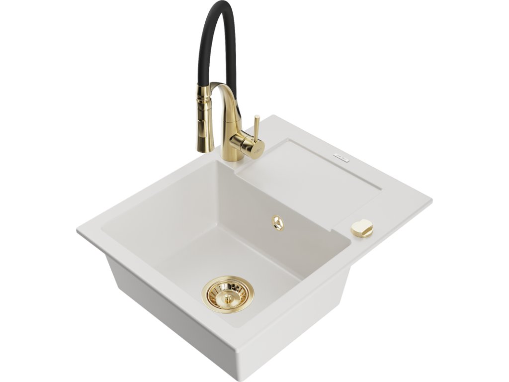 Granitový drez Mexen Enzo s 1 misou, odkapávačom a batériou Aster, biely - 6506-20-73450-57-G