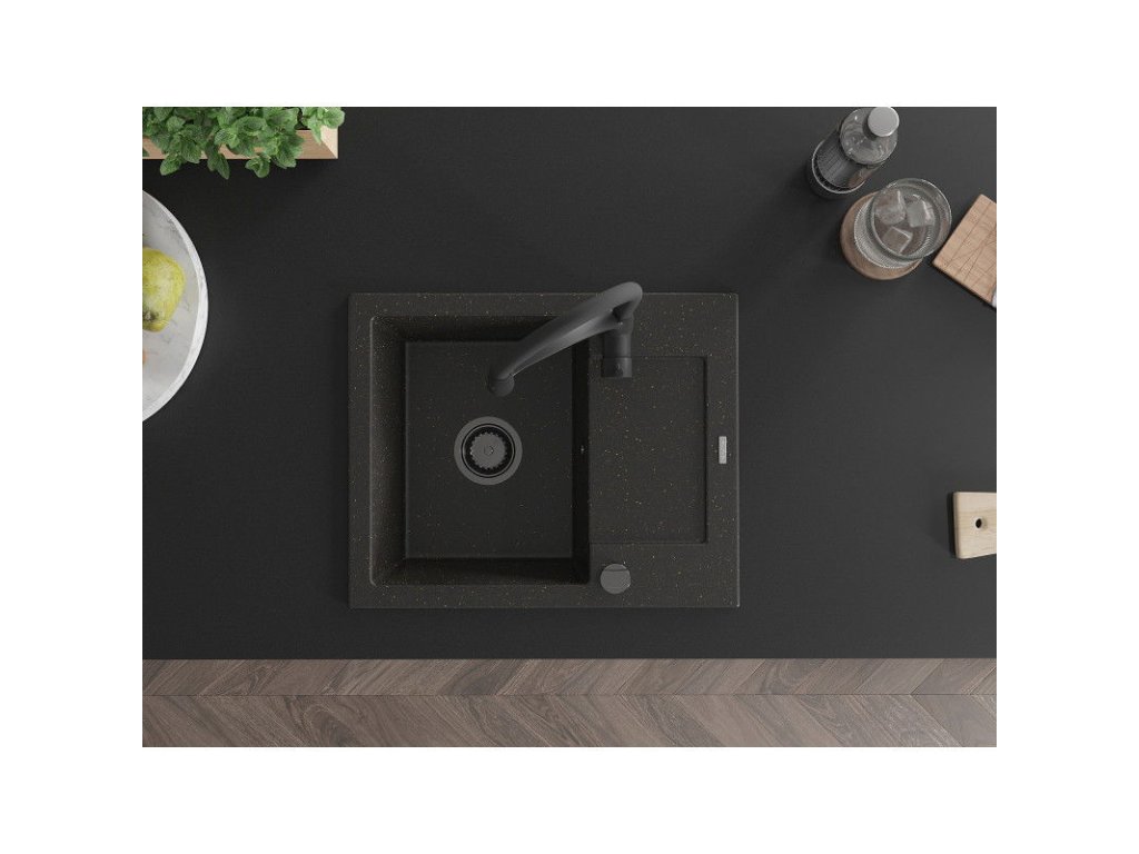Granitový drez Mexen Enzo s 1 misou, odkapávačom a batériou Aster, čierna/zlatá metalíza - 6506-75-73450-70-B