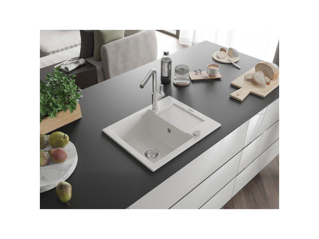 Granitový drez Mexen Enzo s 1 misou, odkapávačom a batériou Flora, biely - 6506-20-670401-00