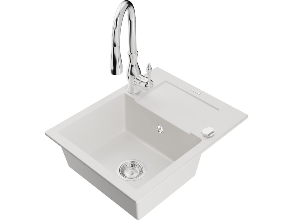 Granitový drez Mexen Enzo s 1 misou, odkapávačom a batériou Savita, biely - 6506-20-672601-00
