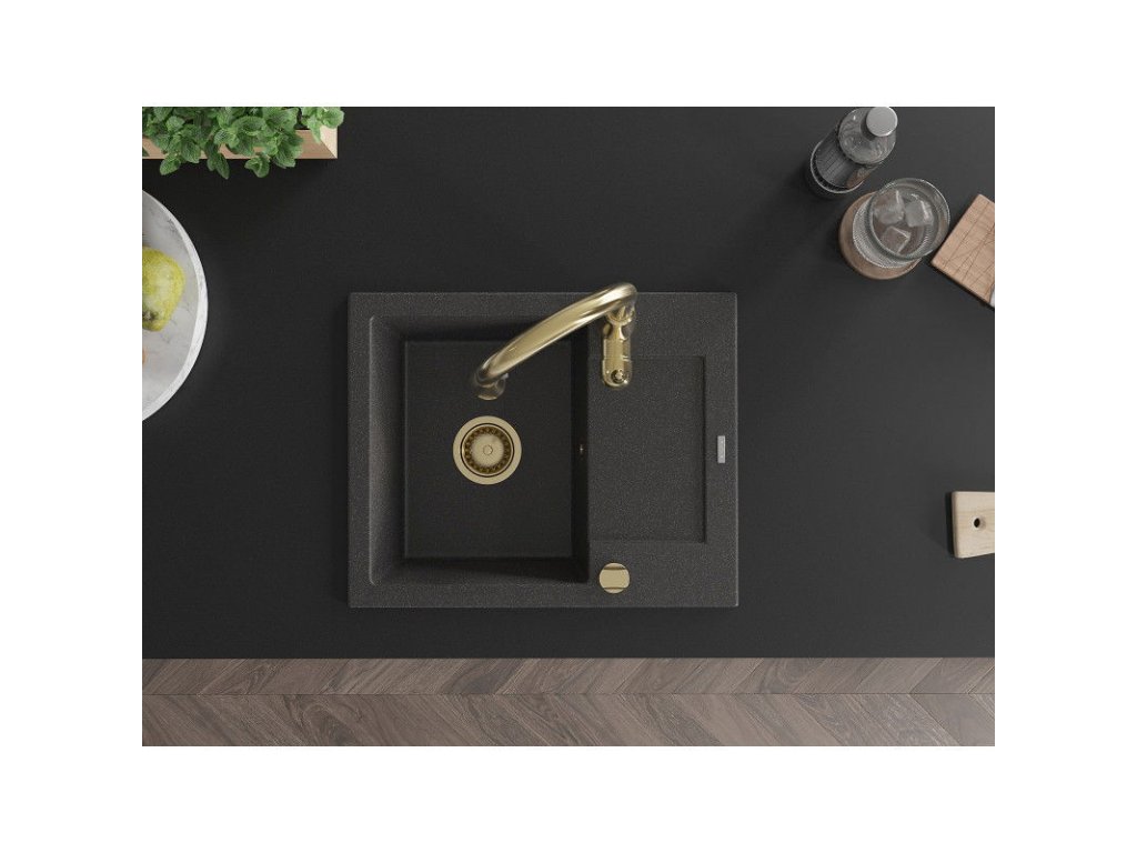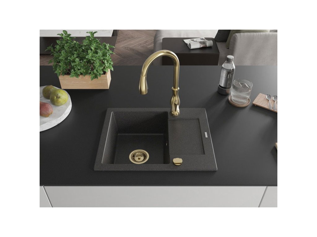 Granitový drez Mexen Enzo s 1 misou, odkapávačom a batériou Savita, čierna škvrnitá - 6506-76-672601-50