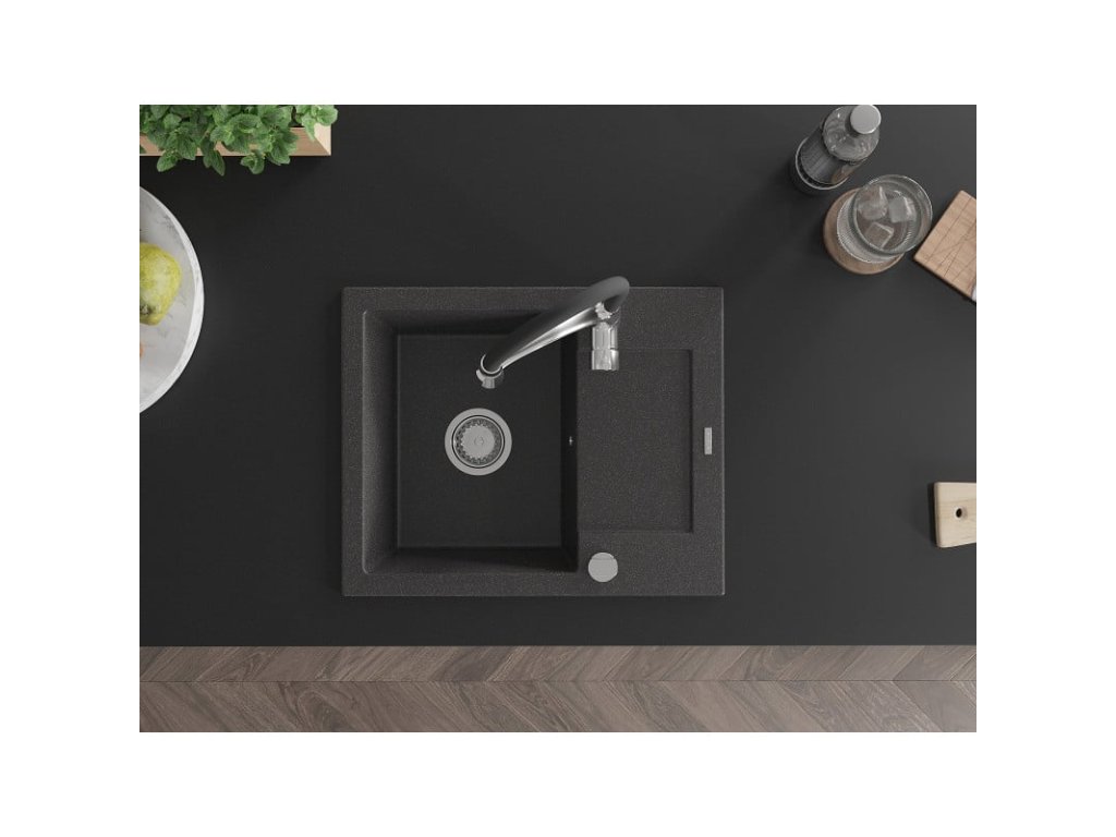 Granitový drez Mexen Enzo s 1 misou, odkapávačom a kuchynskou batériou Aster, čierny bodkovaný - 6506-76-73450-07