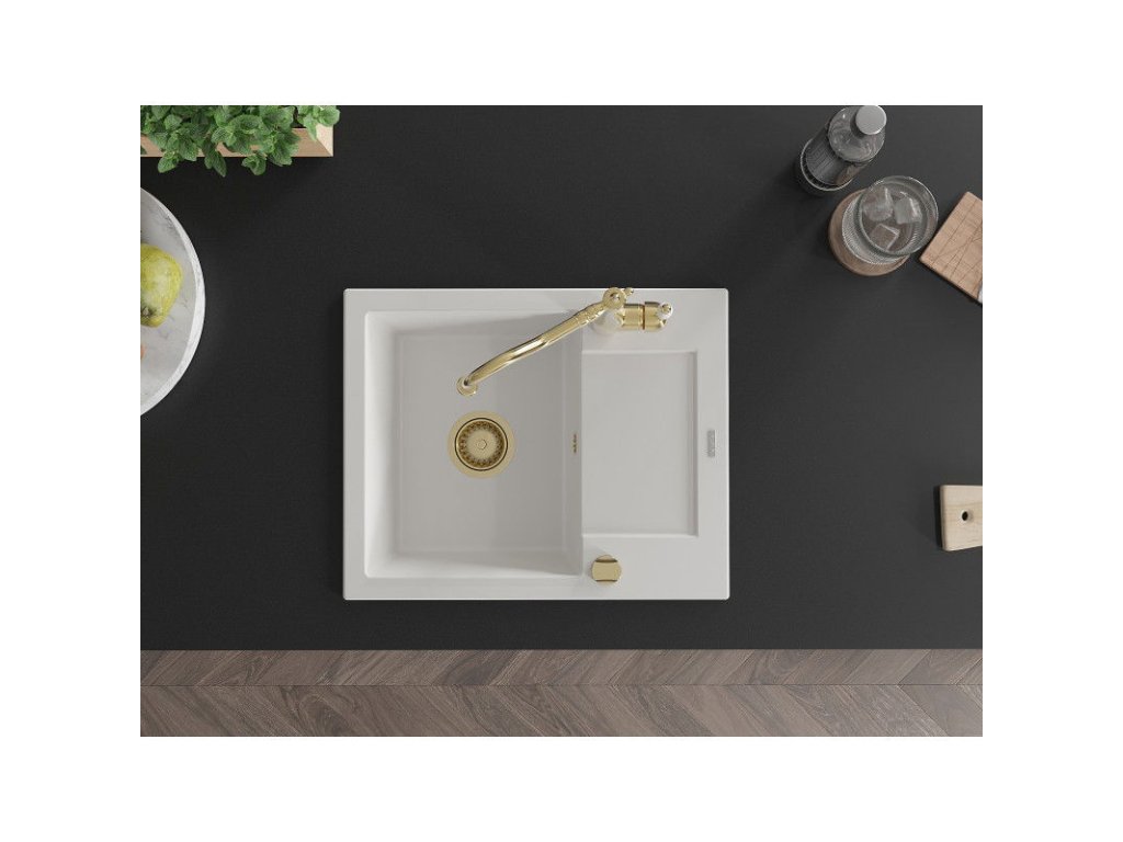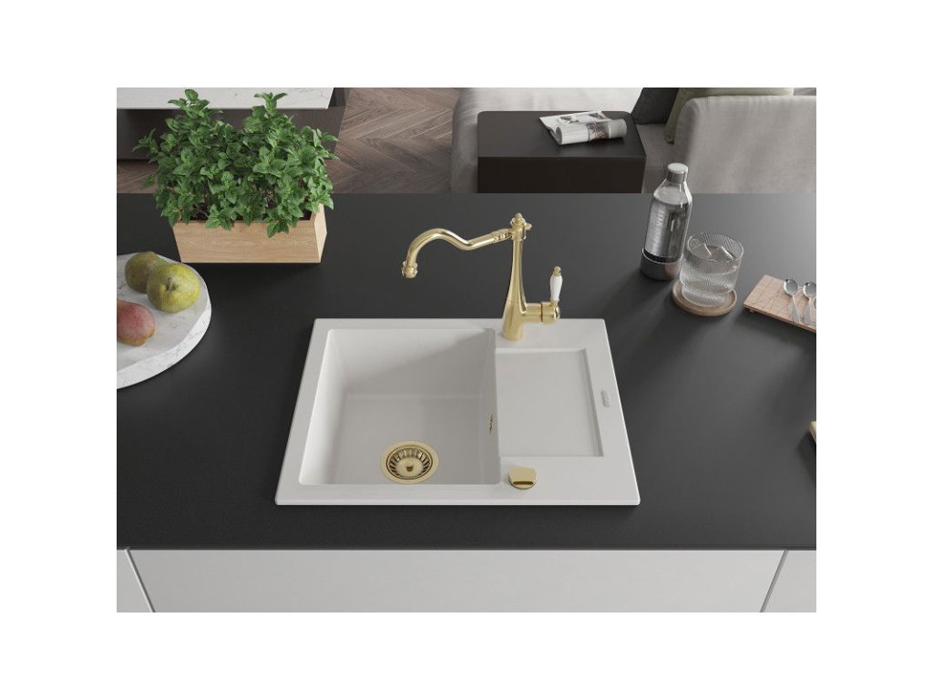 Granitový drez Mexen Enzo s 1 misou, odkapávačom a kuchynskou batériou Carla, biely - 6506-20-670700-50