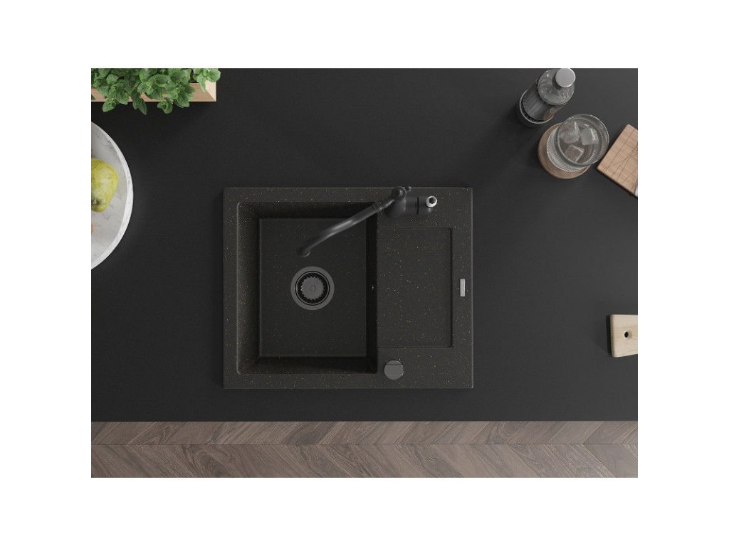 Granitový drez Mexen Enzo s 1 misou, odkapávačom a kuchynskou batériou Carla, čierna/zlatá metalíza - 6506-75-670700-70-B
