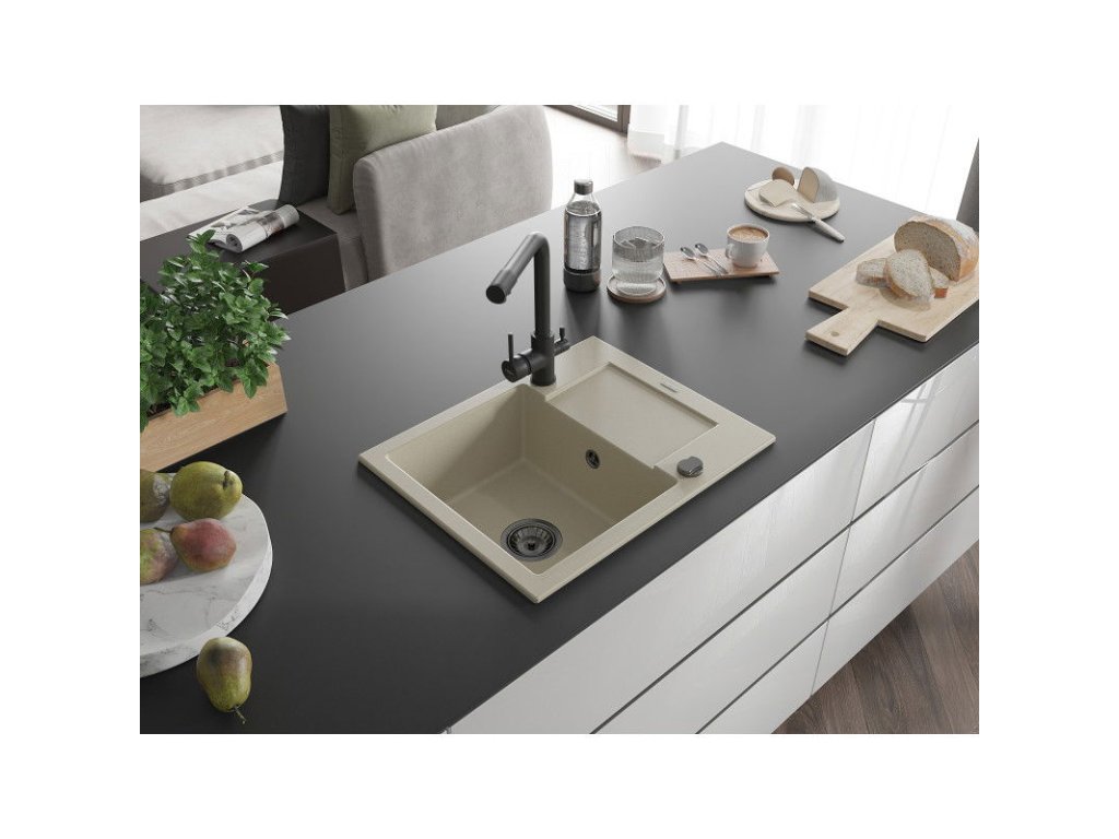 Granitový drez Mexen Enzo s 1 misou, odkapávačom a kuchynskou batériou Duero, béžový - 6506-69-671600-70