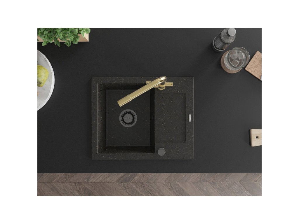 Granitový drez Mexen Enzo s 1 misou, odkapávačom a kuchynskou batériou Duero, čierna/zlatá metalíza - 6506-75-671600-50-B