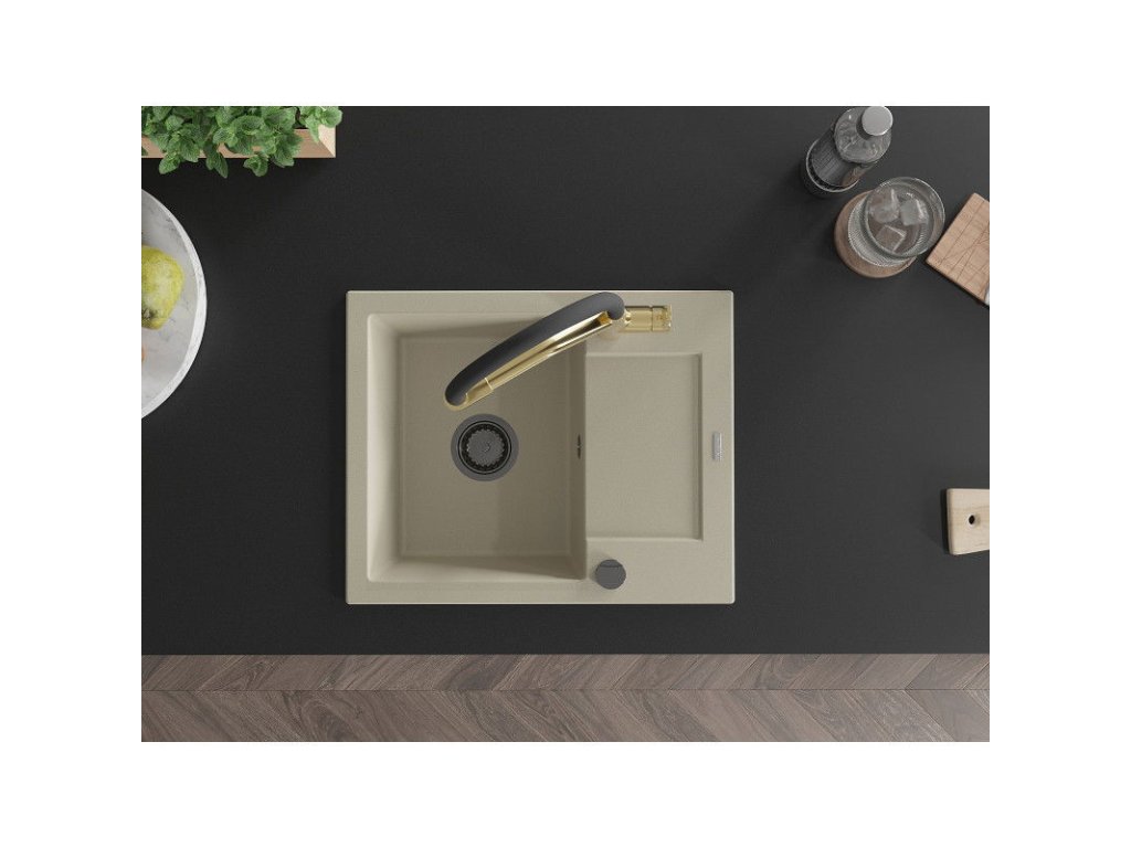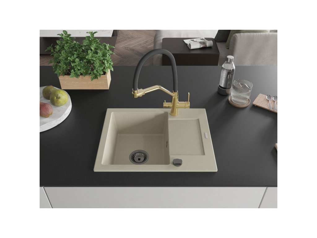 Granitový drez Mexen Enzo s 1 misou, odkapávačom a kuchynskou batériou Duo, béžový - 6506-69-671701-57-B
