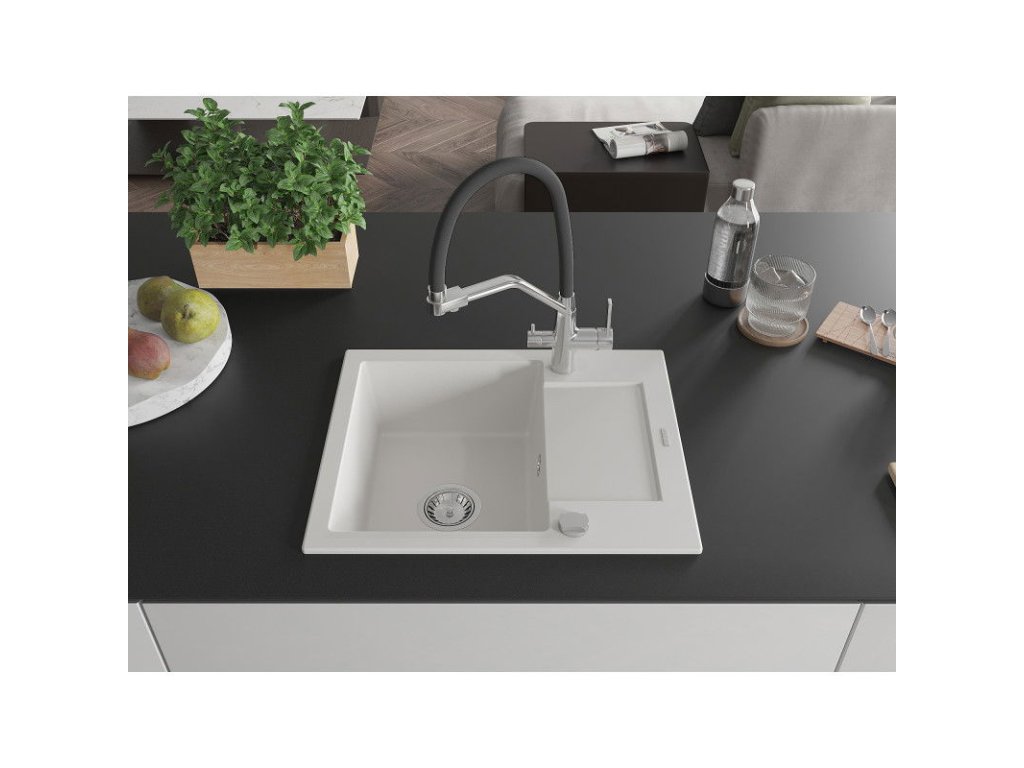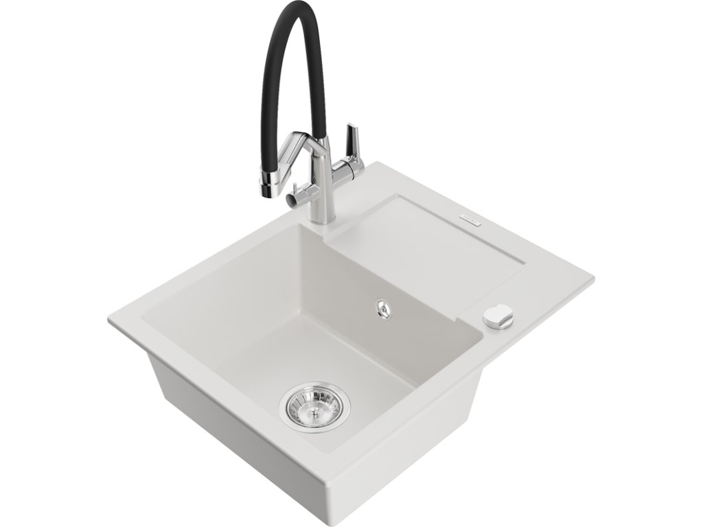 Granitový drez Mexen Enzo s 1 misou, odkapávačom a kuchynskou batériou Duo, biely - 6506-20-671701-07
