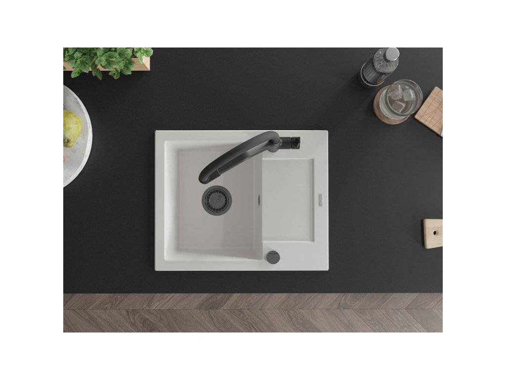 Granitový drez Mexen Enzo s 1 misou, odkapávačom a kuchynskou batériou Duo, biely - 6506-20-671701-70-B