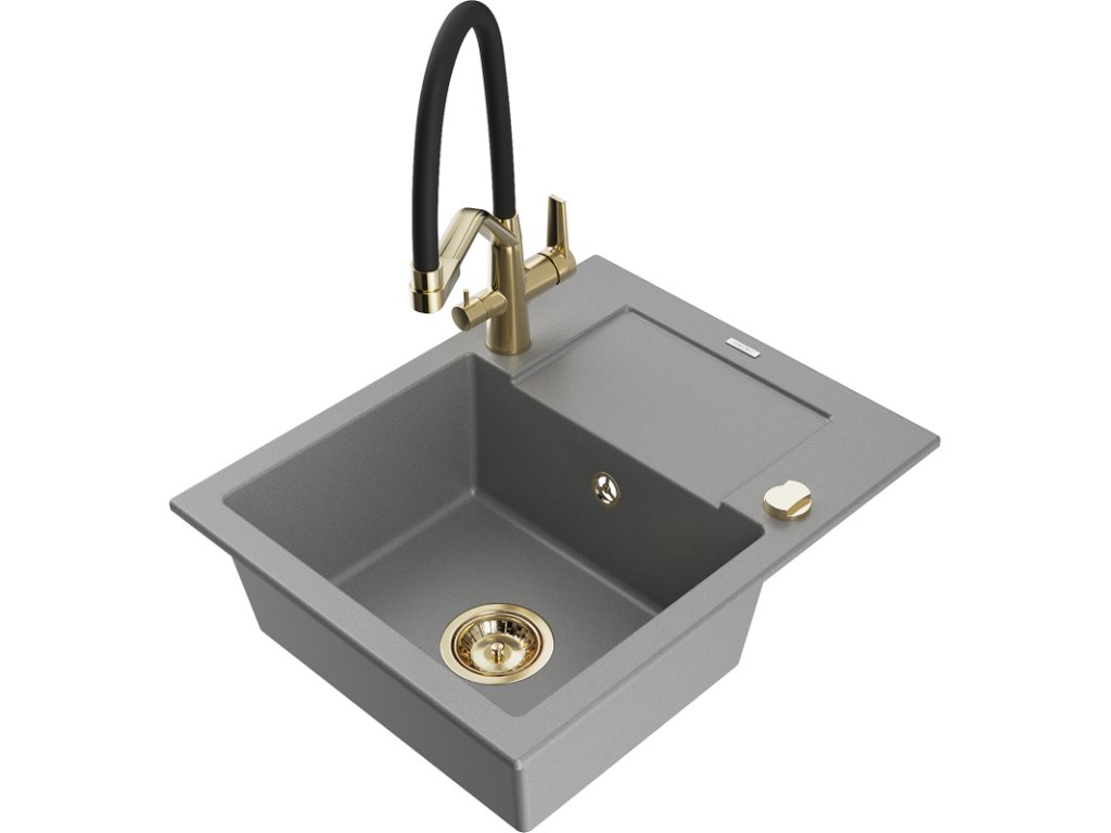 Granitový drez Mexen Enzo s 1 misou, odkapávačom a kuchynskou batériou Duo, sivý - 6506-71-671701-57-G