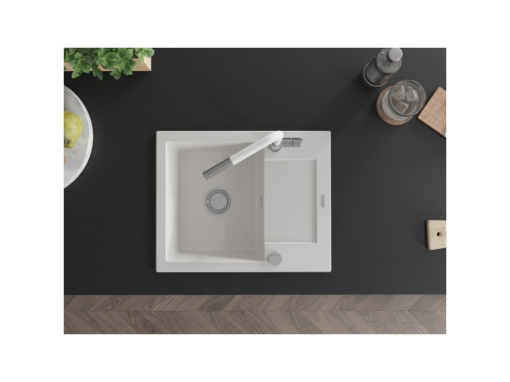 Granitový drez Mexen Enzo s 1 misou, odkapávačom a kuchynskou batériou Flora, biely - 6506-20-670401-02