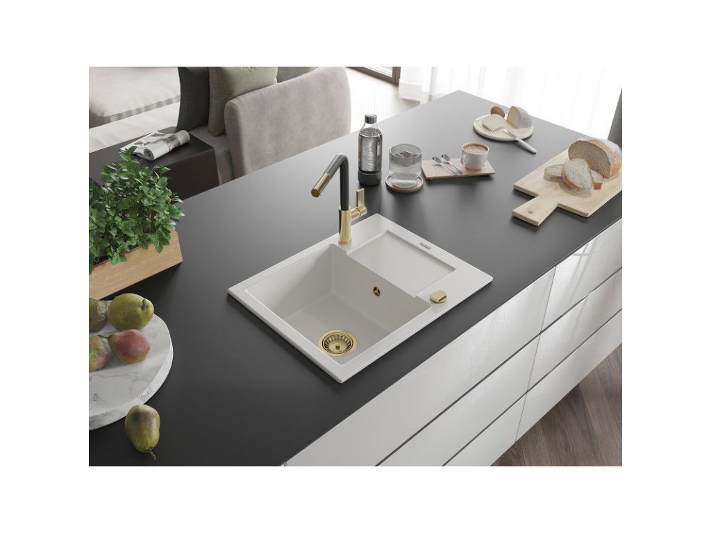 Granitový drez Mexen Enzo s 1 misou, odkapávačom a kuchynskou batériou Flora, biely - 6506-20-670401-57-G