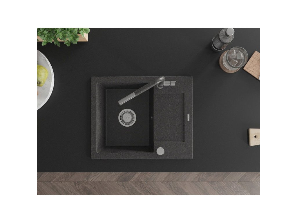 Granitový drez Mexen Enzo s 1 misou, odkapávačom a kuchynskou batériou Flora, čierna škvrnitá - 6506-76-670401-08