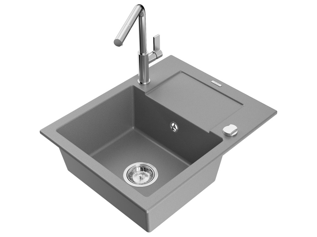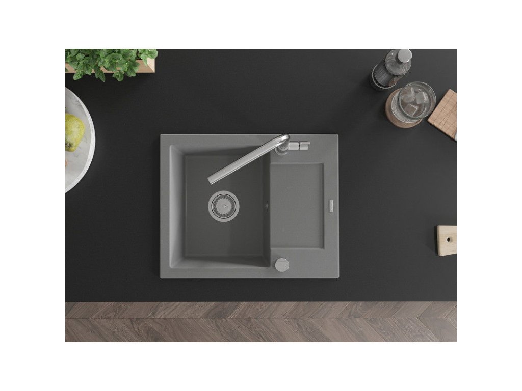 Granitový drez Mexen Enzo s 1 misou, odkapávačom a kuchynskou batériou Flora, sivý - 6506-71-670401-00