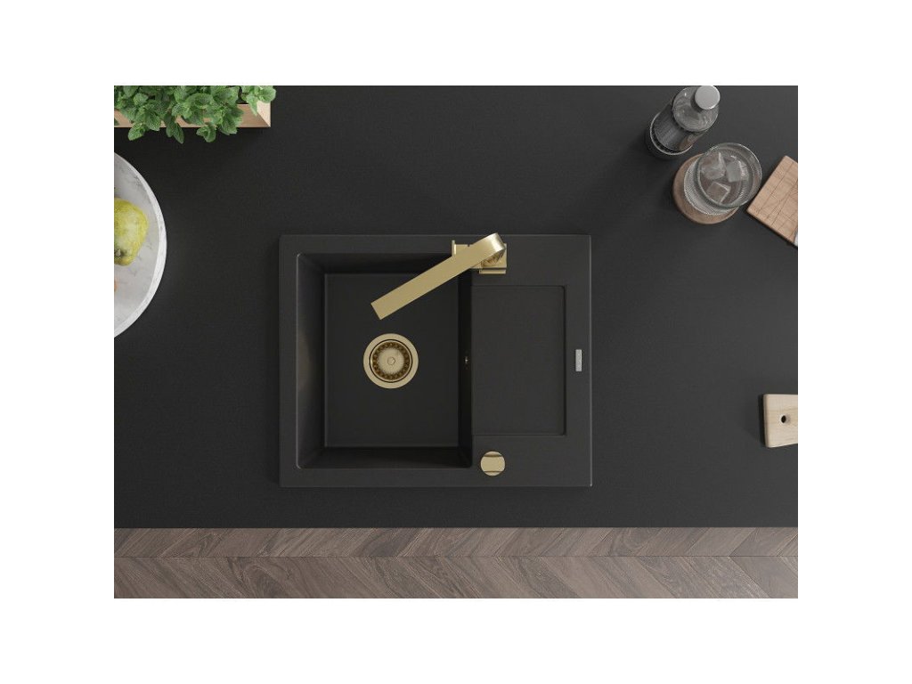 Granitový drez Mexen Enzo s 1 misou, odkapávačom a kuchynskou batériou Rita, čierny - 6506-77-670300-50