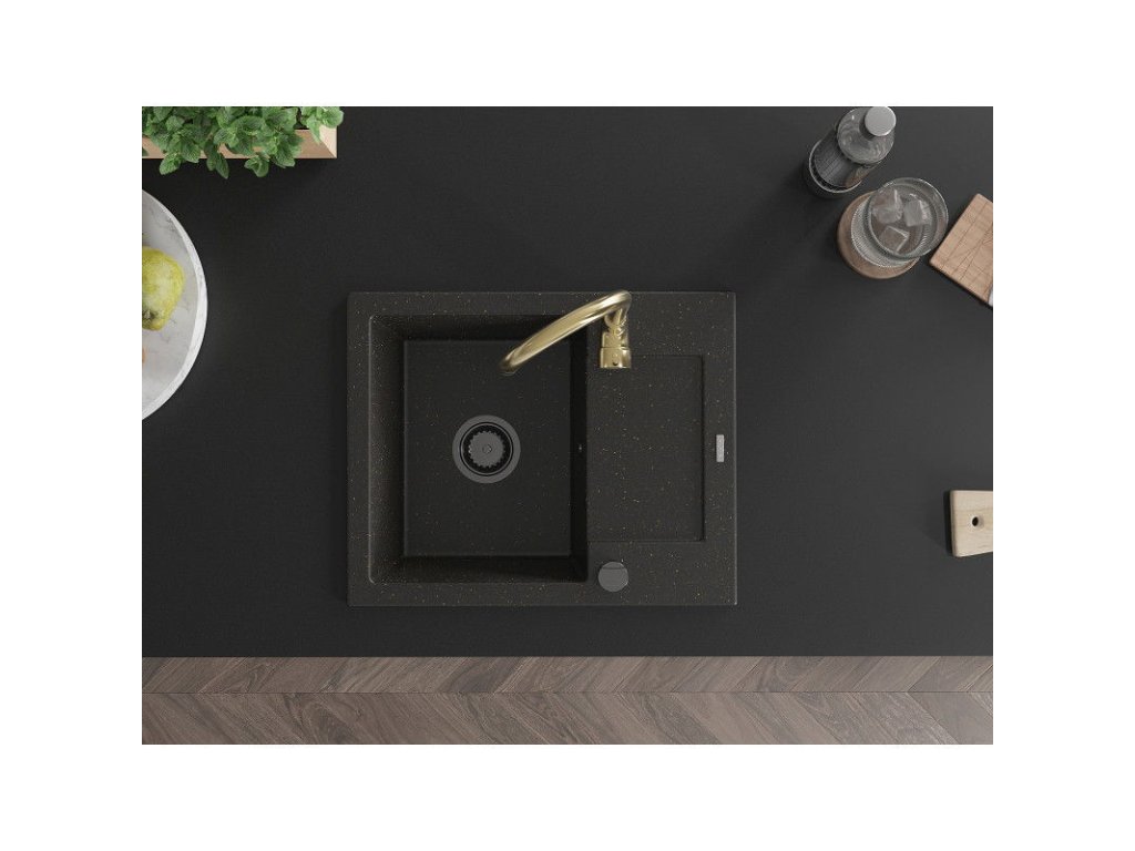 Granitový drez Mexen Enzo s 1 misou, odkapávačom a kuchynskou batériou Telma, čierna/zlatá - 6506-75-670200-50-B
