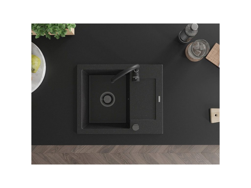 Granitový drez Mexen Enzo s 1 misou, odkapávačom a kuchynskou batériou Telma, čierny/strieborný - 6506-73-670200-70-B