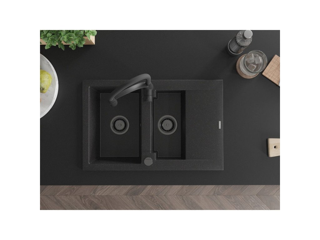 Granitový drez Mexen Gaspar s 1,5 miskou, odkapávačom a kuchynskou batériou Aster, čierny/strieborný - 6507-73-73450-70-B