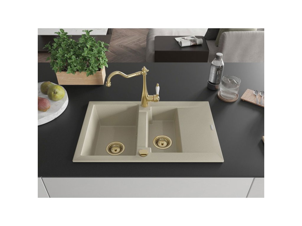 Granitový drez Mexen Gaspar s 1,5 miskou, odkapávačom a kuchynskou batériou Carla, béžový - 6507-69-670700-50