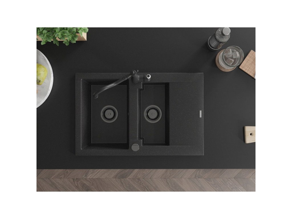 Granitový drez Mexen Gaspar s 1,5 miskou, odkapávačom a kuchynskou batériou Carla, čierny/strieborný - 6507-73-670700-70-B