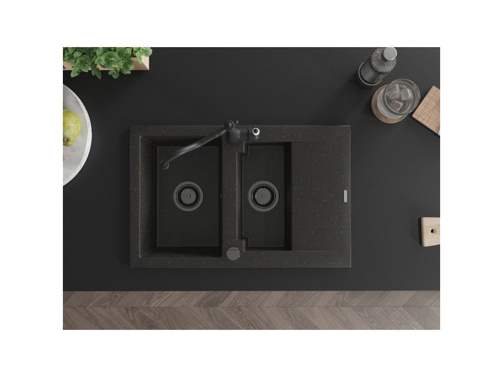 Granitový drez Mexen Gaspar s 1,5 miskou, odkapávačom a kuchynskou batériou Carla čierna/zlatá metalíza - 6507-75-670700-70-B